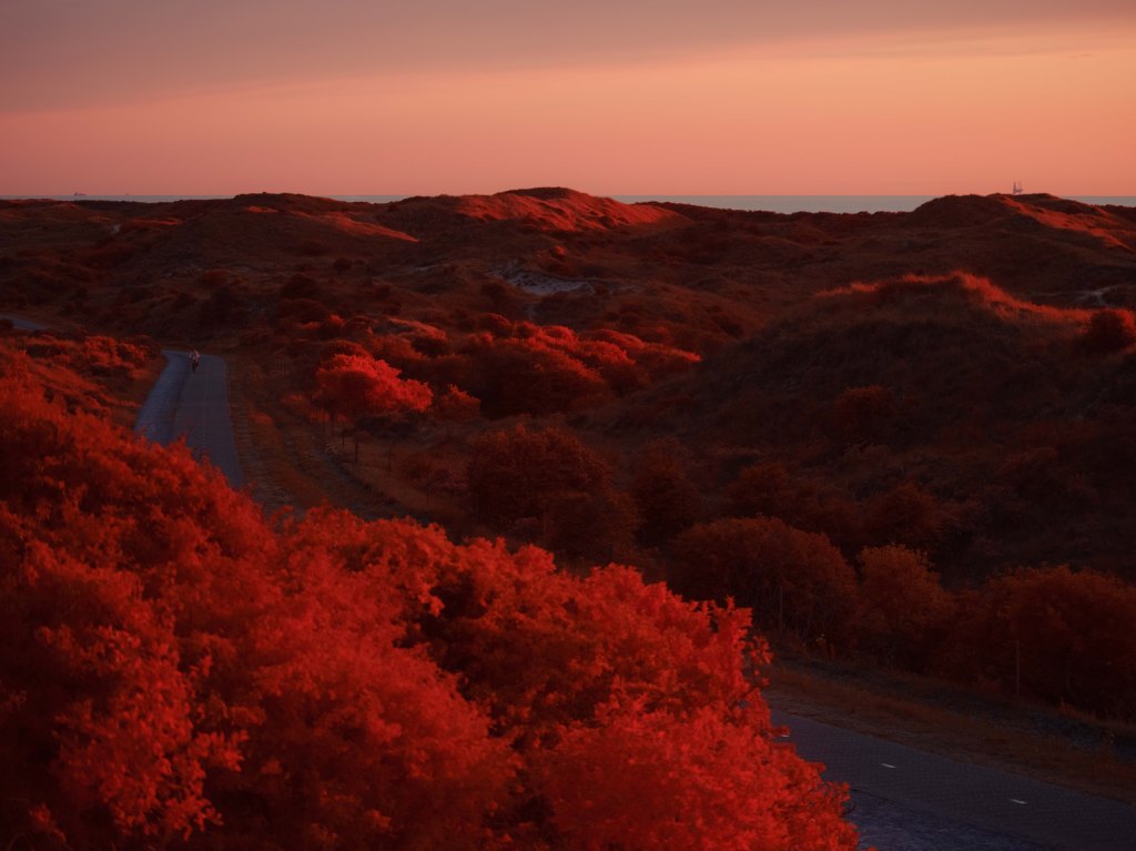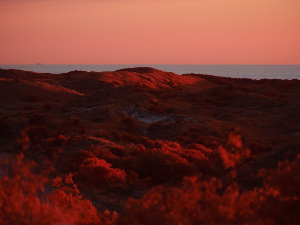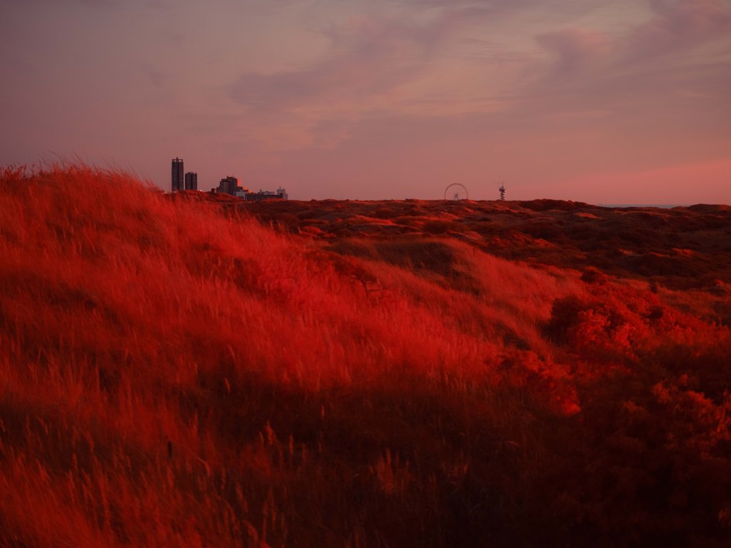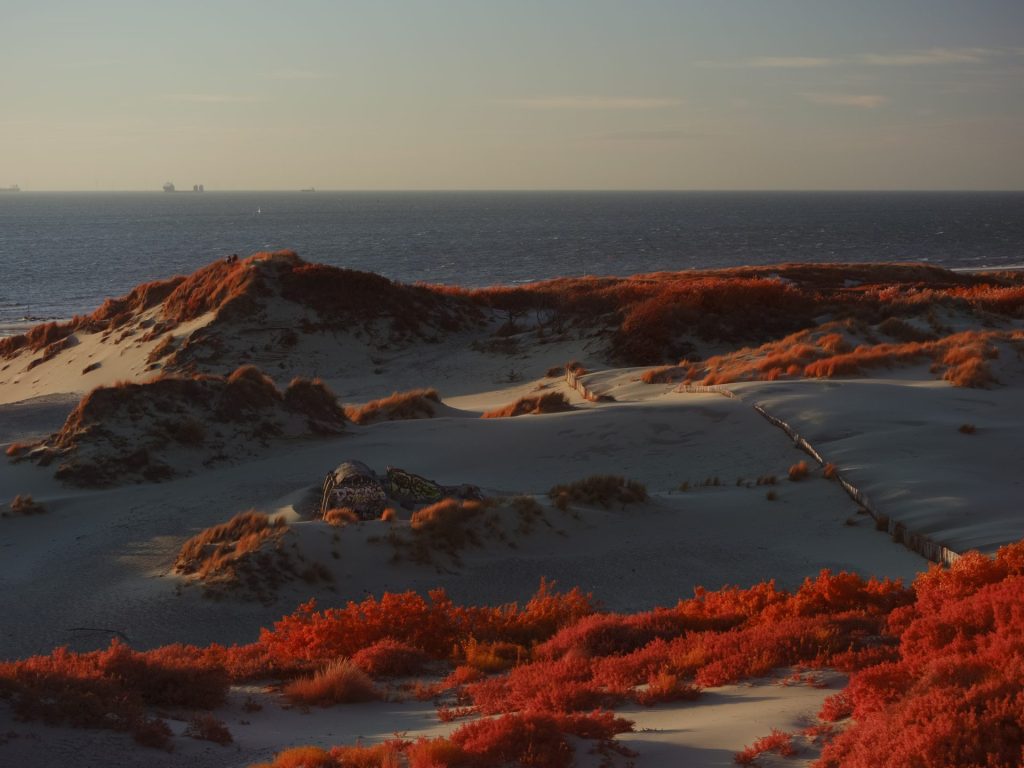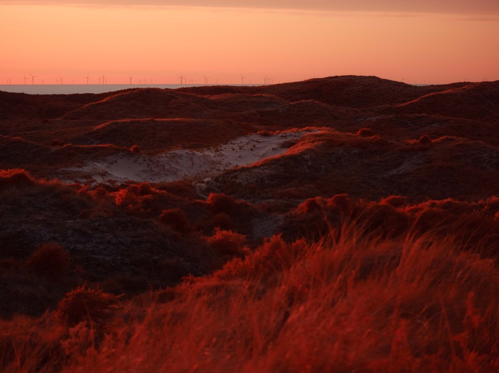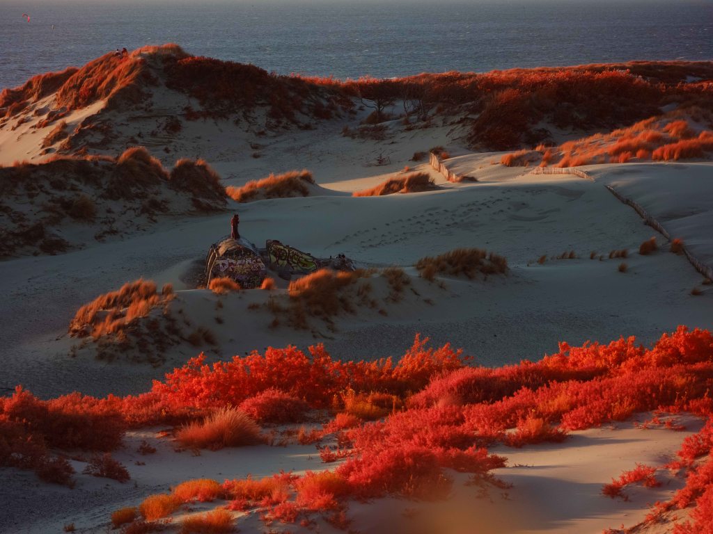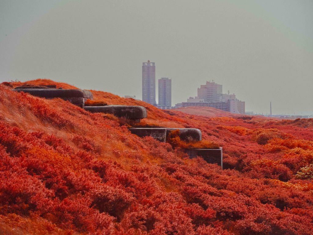The above infrared image was taken from atop the decaying and long abandoned Nazi built ‘V143 “Mammut” Radar Bunker’ in Kijkduin, South Holland. This image taken on a Fujifilm GFX50s full spectrum converted camera with a Kolari IR Chrome (i.e., digital Kodak Aerochome) multiband filter attempts to reveal the multifaceted nature of the Dutch North Sea dunes. In the foreground in bright vibrant red hues are sea thistle and sea buckthorn bushes which stabilise the dune system minimising wind erosion. Towards the middle of the image is a partially submerged WWII era bunker, a painful reminder of Nazi occupation. Running diagonally across the image is a fence to control the movements of the many animals that live within the dunes. In the background rising as high as 20 metres are sand dunes covered in marram grass, serving as natural sea barriers — protecting as much as 30% of the landmass of the Netherlands which lies under sea level. In the far distance are oil tankers waiting to dock with the 150 or so oil and gas platforms in the Dutch North Sea — hulking reminders of a fossil-fuel economy whose emissions drive the climate crisis, bringing sea-level rise, stronger storms, pollution and the risk of spills that directly and indirectly threaten the fragile dune ecosystems that shield the low-lying coast. In contrast, the horizon also reveals faint silhouettes of the 500 offshore wind turbines which provide around 25% of the Netherlands’ clean energy.