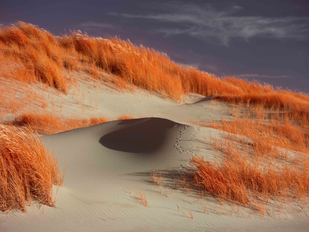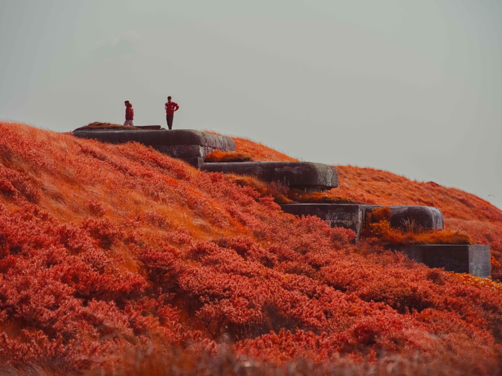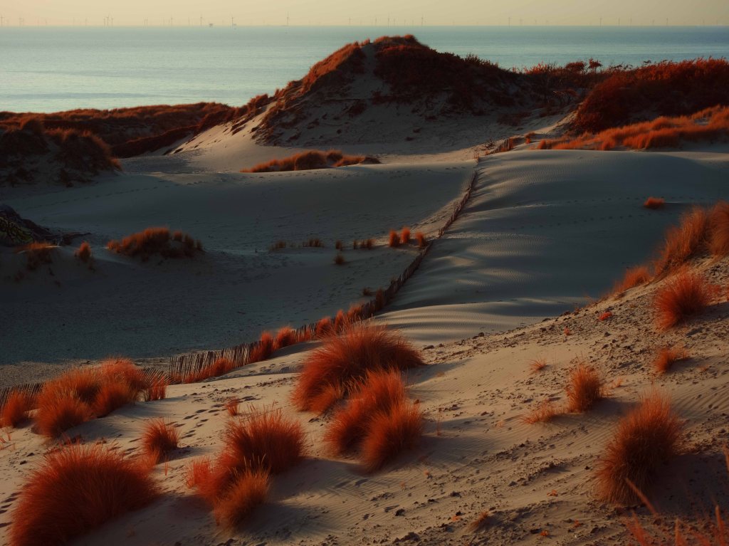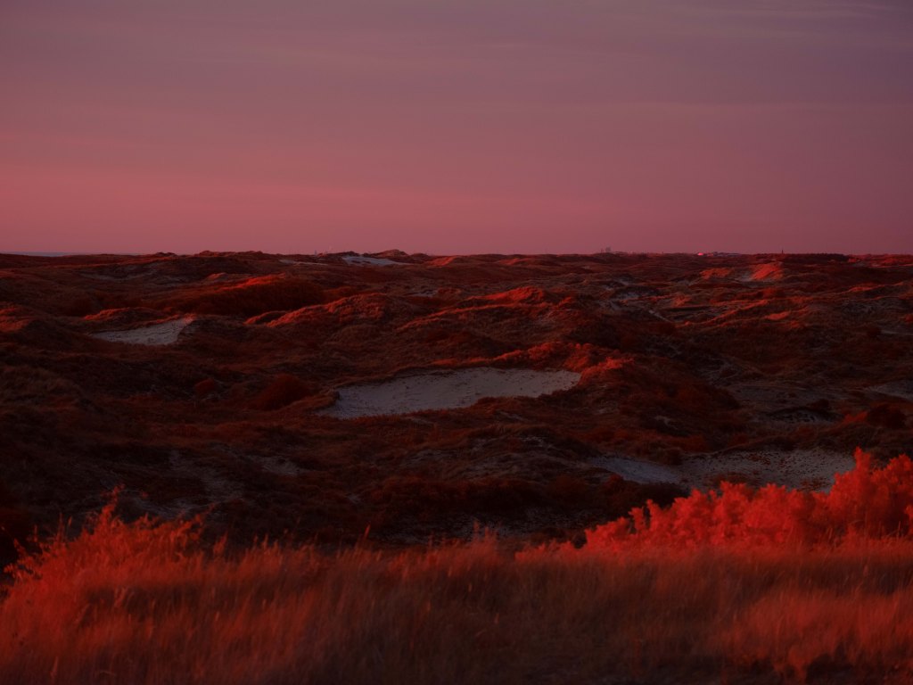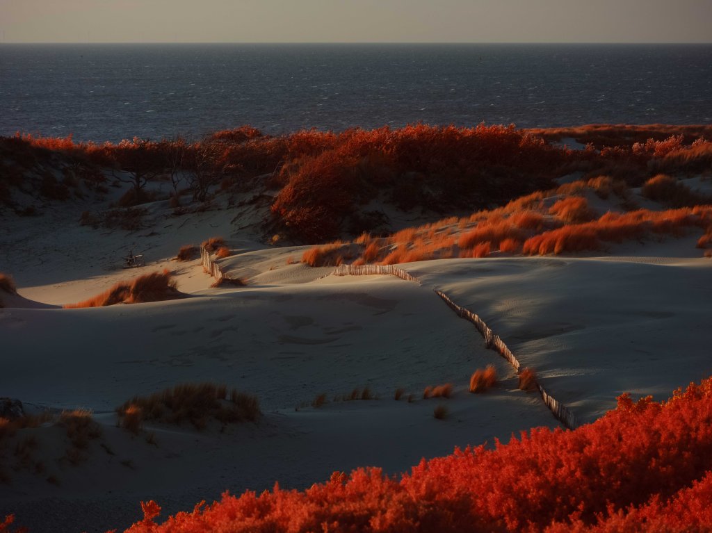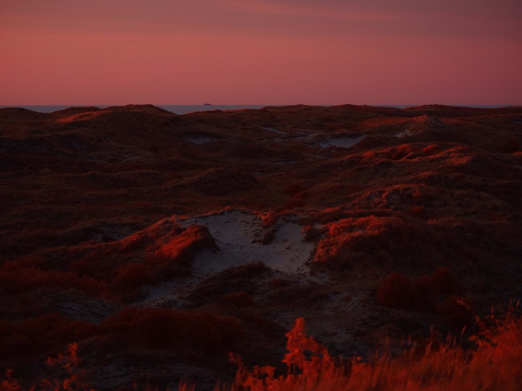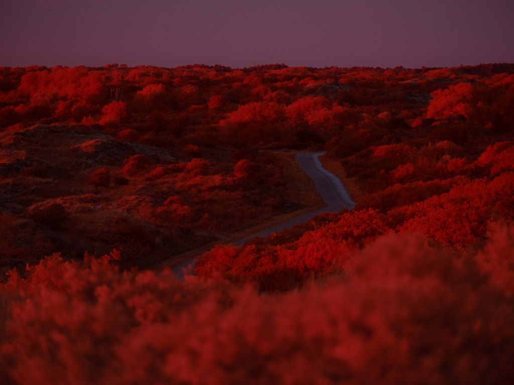 The above infrared image was taken from atop the decaying and long abandoned Nazi built ‘V143 “Mammut” Radar Bunker’ in Kijkduin, South Holland. This image taken on a Fujifilm GFX50s full spectrum converted camera with a Kolari IR Chrome (i.e., digital Kodak Aerochome) multiband filter attempts to reveal the multifaceted nature of the Dutch North Sea dunes. In the foreground in bright vibrant red hues are sea thistle and sea buckthorn bushes which stabilise the dune system minimising wind erosion. Towards the middle of the image is a partially submerged WWII era bunker, a painful reminder of Nazi occupation. Running diagonally across the image is a fence to control the movements of the many animals that live within the dunes. In the background rising as high as 20 metres are sand dunes covered in marram grass, serving as natural sea barriers — protecting as much as 30% of the landmass of the Netherlands which lies under sea level. In the far distance are oil tankers waiting to dock with the 150 or so oil and gas platforms in the Dutch North Sea — hulking reminders of a fossil-fuel economy whose emissions drive the climate crisis, bringing sea-level rise, stronger storms, pollution and the risk of spills that directly and indirectly threaten the fragile dune ecosystems that shield the low-lying coast. In contrast, the horizon also reveals faint silhouettes of the 500 offshore wind turbines which provide around 25% of the Netherlands’ clean energy.