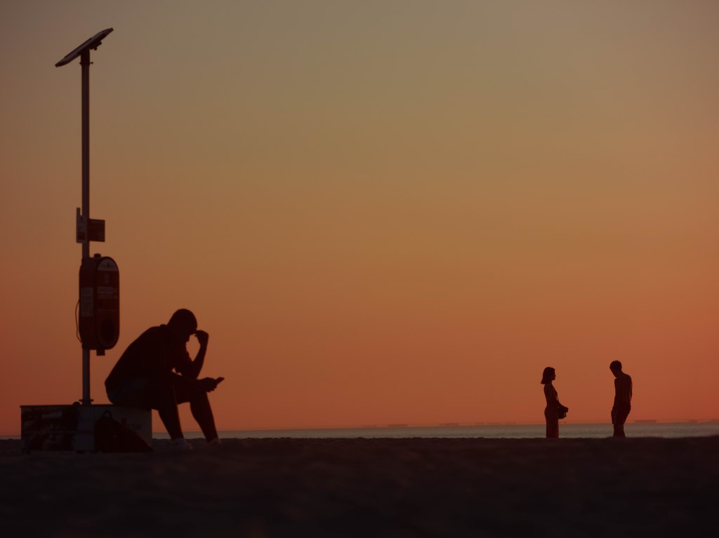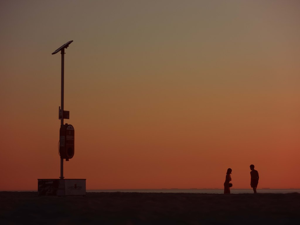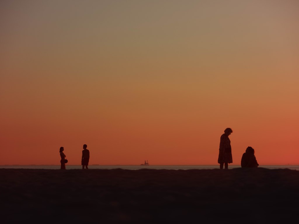 As the sun sets on a hot summer evening along the Dutch North Sea coast, two women form a stark contrast against the vibrant orange hued sky. Further down the beach, two young people share a moment, their silhouettes suggesting a quiet intimacy. In the far distance, the industrial outline of an offshore oilrig pierces the horizon, a modern counterpoint to the natural beauty. Kijkduin, Zuid Holland, June 2025.